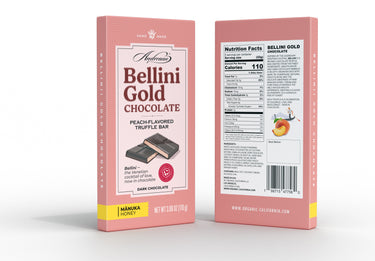 Inspired by the legendary Venetian cocktail, Bellini is a refined chocolate truffle bar crafted from the finest ingredients. Smooth white and dark chocolate embrace a velvety cream infused with marc de champagne, natural peach flavor, and the delicate sweetness of raw Manuka honey. Cream and pure vanilla enhance the melt-in-your-mouth experience, creating a flavor as romantic as a gondola ride at sunset.